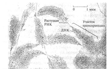 Рис. 9.3. Электронная микрофотография транскрипции РНК. ДНК имеет вид тонкой нити, проходящей через центр каждого участка, похожего по форме на перо. От ДНК отходят молекулы РНК: транскрипция самых длинных уже почти закончилась, транскрипция самых коротких только началась. Это рибосомные РНК, которые входят в структуру рибосом Обычно в ходе таких экспериментов денатурируют ДНК и пропускают раствор одинарных цепей через нитроцеллюлозные фильтры. Если на эти фильтры нанести раствор меченой РНК, то РНК-транскрипты с комплементарными последовательностями соединятся с ДНК, и их можно будет легко обнаружить измерив радиоактивность фильтра. Молекулы РНК, не имеющие комплементарной последовательности, не соединятся с ДНК и пройдут через фильтр. В молекуле ДНК две цепи. Мы показали, как одна из цепей служит матрицей для РНК-полиме-разы, которая строит РНК. Но что если матрицей для разных РНК в разное время служат разные цепи ДНК? Джулиус Мармур попытался дать ответ в эксперименте с фагом SP8. ДНК этого фага представляет собой одну двойную молекулу, цепи которой сильно отличаются по плотности (чем больше гуанина в цепи, тем она плотнее), поэтому их легко разделить в растворе CsCl с градиентом плотности. Выяснилось, что РНК, образовавшаяся после инфицирования SP8, образует гибриды только с одной из цепей. Это доказывает, что матрицей для синтеза РНК служит только одна цепь ДНК. В случае с другими вирусами и большинством остальных клеток оказалось, что для синтеза РНК используются различные участки разных цепей ДНК, но, как правило, на протяжении отдельного участка транскрибируется только одна цепь. Этого и следовало ожидать, так как молекулы РНК, транскрибированные с комплементарных цепей одного гена, кодировали бы совершенно разные белки, и только один из них был бы функциональным белком этого гена. Теперь, в свете всего сказанного, следует несколько расширить понятие гена, так как в клетках имеются два типа генов. Большинство генов кодируют информацию для синтеза специфического вида белка; транскриптами с этих генов служат мРНК, которые и заведуют синтезом белка. В ДНК также должны быть включены последовательности для синтеза стабильных рибосомных и транспортных РНК, поэтому в геноме содержатся гены для рРНК и тРНК. Продуктами этих генов служат не белки, а РНК-транскрипты, стабильные компоненты клеток, составляющие часть аппарата по синтезу белка, как будет показано далее.