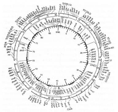 Рис. 10.2. Карта хромосомы Е. coli. Единицами служат минуты, то есть промежутки времени, через которые переносятся гены при скрещивании Hfr x F--. Отдельные участки карты с большим количеством известных генов более подробно показаны на внешних сегментах. Более мелкие подробности определяются в процессе трансдукции, о чем говорится далее. Данная карта была опубликована несколько лет назад, и сейчас существуют более подробные карты, которые заняли бы несколько страниц