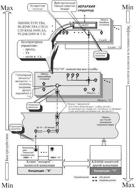 Видение этой статистики, некоторые знания психологии людей, позволяют строить такого рода цепи целенаправленно. Количество звеньев в них будет не 10 — 20, а гораздо менее, что делает их быстродействие достаточно высоким для осуществления стратегического управления, а подбор кадров для них (естественно негласный, «втёмную») обеспечивает достаточно высокую степень сохранения при передаче стратегической управленческой информации. Дело в том, что стратегическая информация в своём большинстве достаточно компактна, требует для упаковки весьма мало слов и символов и не нуждается в рукотворных носителях, которые могут стать уликами в юридическом понимании этого слова. На схеме рис. 1 показана иерархия структур и некий лидер, возглавляющий одну из них. Такого рода структурой может быть аппарат главы государства, министерство, спецслужба, научно-исследовательский институт, лаборатория в его составе, проектно-конструкторское бюро, редакция и т.п. Структура представляет собой некое штатное расписание. Персонал, наполняющий клетки штатного расписания, условно можно разделить на две категории: · аппаратную “шушеру”, которой «что бы ни делать, лишь бы не работать»; · работающих специалистов, которые более или менее «болеют за дело». Из числа вторых можно выделить ещё одно подмножество — нескольких человек, мнение которых как профессионалов значимо для лидера структуры при руководстве ею. На схеме один из таких специалистов указан и назван действительным тайным советником “вождя”. Но люди далеко не всё время проводят на работе. Есть ещё круг неформального общения. При этом «действительные тайные советники» многих публичных лидеров или деятелей, широко известных в узких кругах специалистов, вхожи в дома популярных личностей, чьё мнение более или менее авторитетно во всём обществе. В дома такого рода “звёзд” вхожи и многие другие люди. Среди них могут быть и школьные, и вузовские друзья “звёзд-авторитетов”, которые и сами не обделены талантом. И хотя они в силу разных причин не смогли или не пожелали обрести высоких титулов, но к их мнению прислушиваются их высокоавторитетные друзья, по отношению к которым они выступают в роли домашних действительных тайных советников. Фактически они “опекуны” общесоциальных “авторитетов” — культовых личностей. Множество из тех интеллектуалов, кто возмущался и возмущается культом личности Сталина, сами являются культовыми личностями, вкупе с теми звёздами эстрады, спорта и шоу-бизнеса, кому нет до общественных в целом проблем никакого дела. Но если смотреть на общественную жизнь в целом, то нет разницы одна в обществе культовая личность для всех, либо в нём сонм культовых личностей, удовлетворяющий нужду в низкопоклонстве и кумиротворении разных общественных групп в нём. Опекуны могут знать, что они выполняют миссию опекунства, но могут использоваться втёмную так же, как и действительные тайные советники. Либо непосредственно, либо через некоторое количество промежуточных звеньев на опекунов выходят представители наследственных кланов знахарей концепции общественного управления. Они могут быть воспитателями опекунов с детства. Это может быть деревенский дедушка, бабка, сосед по даче где-то за сотни километров от основного места жительства “опекуна”. Возможно, что и не получив выс