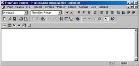 Команды главного меню FrontPage Express Рабочее окно пакета FrontPage Express Внешний вид рабочего окна пакета FrontPage Express (см. рис. 9.1) очень напоминает рабочее окно Microsoft Word (или WordPad - стандартного текстового редактора Windows).