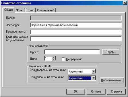 Рис. 9.1. Рабочее окно FrontPage Express Да и технология создания документов в FrontPage Express практически такая же, как и в текстовых редакторах. На строке заголовка отображается название пакета и имя файла активного документа. Ниже строки заголовка располагается строка главного меню. В редакторе гипертекстовых документов Microsoft FrontPage Express все наборы команд и опций, использующиеся в процессе работы, содержатся в главном меню. В меню Файл содержатся команды создания, сохранения, открытия, печати документа. Эти команды выполняются так же, как и аналогичные команды в Microsoft Word. Особое внимание в меню Файл следует обратить на команду Свойства страницы, диалоговое окно которой показано на рис. 9.2.