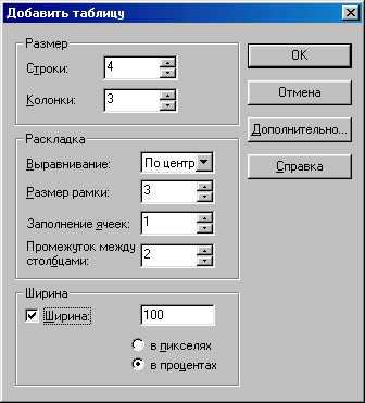 Дизайн web-страниц с помощью таблиц Мощнейшее средство HTML - таблицы - позволяют создавать достаточно сложный дизайн web-страницы, например, расположить текст вашего документа в нескольких колонках, организовать фотоальбом или галерею рисунков и т.п. Вставка таблицы в документ Для того чтобы разместить в вашем документе таблицу, установите курсор в точку вставки таблицы и вызовите команду Вставить таблицу меню Таблица. В открывшемся диалоговом окне Добавить таблицу (рис. 9.7) задайте количество строк и столбцов таблицы, тип выравнивания элементов таблицы.