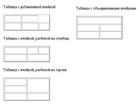 Определите размер линий границ ячеек (Размер рамки) в пикселях (до 100 пикселей). Если размер рамки будет иметь нулевое значение, то линия границы таблицы отобразится пунктирами, а при просмотре документа в обозревателе станет невидимой. Промежуток между столбцами определяет расстояние между столбцами в пикселях. Ширина указывает ширину таблицы в пикселях или в процентах от ширины основного окна соответствующего обозревателя. Независимо от того или иного обозревателя, таблица, ширина которой определена в пикселях, будет иметь постоянный размер. Таблица, ширина которой определена в процентах, будет подстраиваться к тому или иному обозревателю. Изменение конфигурации таблицы В готовую таблицу можно добавлять строки, столбцы, ячейки с помощью соответствующих команд меню Таблица. Любую ячейку таблицы можно разбить на столбцы или строки, или, наоборот, объединить несколько ячеек (см. примеры на рис. 9.8)