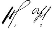 Сильный нажим верхнего росчерка, палочки сжаты, с большим перпендикулярным и толстым росчерком