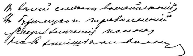 Бледные, наклонные, извивающиеся буквы, иногда встречаются нажимы и недоконченные буквы, местами как бы разорванные и дрожащие.