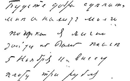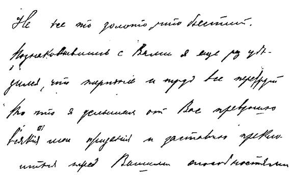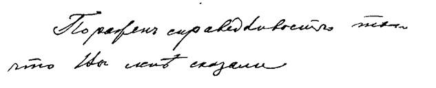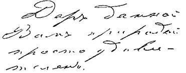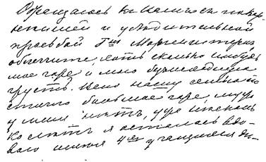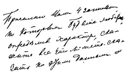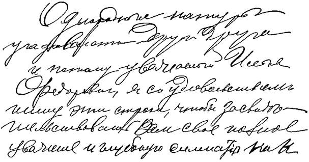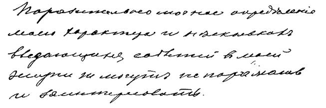 25. Ровные, поднимающиеся вправо строки, буквы тонки, изящны, выработаны благодаря воспитанию, но в них заметна приобретенная индивидуальная форма: крючки тонки, но буквы сильно наклонены и как бы решительно фиксированы. Воспитанность, эстетичность, вкус, смелость, нестесняемость, резкость, последовательность, мужество, отсутствие всякой боязни перед препятствиями, широкая натура.