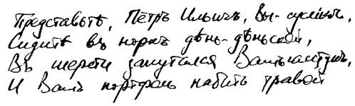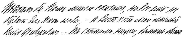 3. Почерк неровный, буквы неопределенной формы, опущены, свободны, жирны, клинообразны, с длинными черточками, заглавные в виде строчных. Деятельность, мечтательность, быстрые переходы от одного настроения к другому, капризы, рассеянность, по временам решительность, много мечтает о себе и преувеличивает, не признает своего возраста, не принимает правильности действий других, любит во все вмешиваться.