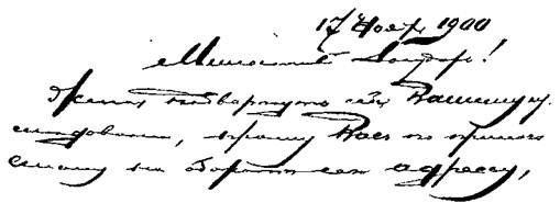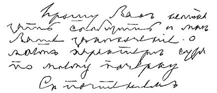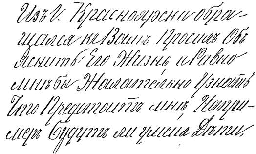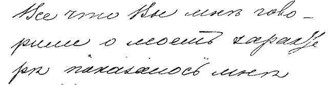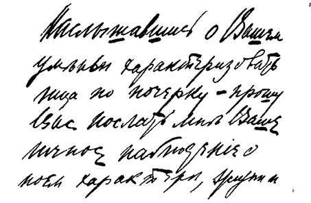 В этом кратком описании я назвал несколько признаков каждой. основной черты характера. В некоторых особенно характерных почерках они могут встретиться в совокупности, но иногда достаточно и одного из них, чтобы распознать ту или иную черту. При этом иногда один и тот же признак письма, в соединении с другими графическими законами, может указать и на другую черту характера, вовсе не опровергая первой: оставаясь неизменным, он лишь подчиняется другим, сильнее выраженным признакам; они как бы дополняют друг друга для более ясного и рельефного выражения индивидуальности писавшего. 1. Кривые, поднимающиеся строки, резкие, связные буквы с углами и косыми нажимами. Тщеславие, живость в решениях, самомнение и вспыльчивость. Нахальство, развращенность.