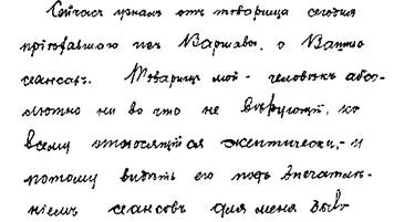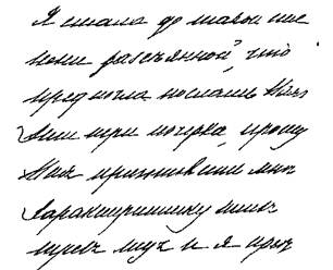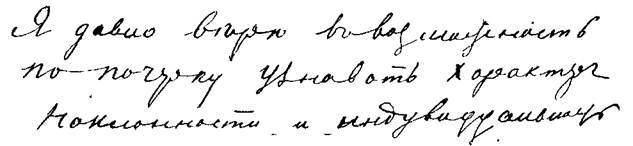 29. Буквы неровные, отрывистые, расстояние между ними неодинаковое, на форму букв как бы не обращали внимания, последняя буква не всегда поставлена, заметна привычка писать по-латыни; буквы местами неразборчивые, сжатые. Сообразительность, правильный взгляд по первому впечатлению, стремление к открытиям в области своей деятельности, скептицизм, любознательность; так пишут доктора, но не хирурги.