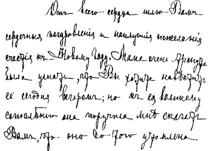 Буквы простые, быстрые, бледные, идут ровно, как бы от опытной руки, естественно красивые, написаны без старания; иногда заметно некоторое дрожание и естественная неровность в почерке.