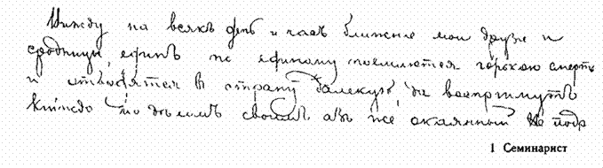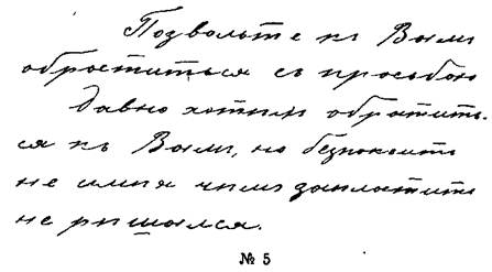Образец № 5. Этот человек приобрел некоторые познания благодаря труду и самообразованию; торговля ему наскучила, и он стал искать свое призвание, благодаря чему его обобрали собственные приказчики. Наклонные, тонкие, но не бледные буквы указывают на чувствительность, нервозность, бесхарактерность. Некоторые буквы как будто стремятся куда-то, что указывает на неопределенность желаний. Буквы местами разделены, местами связаны, что обнаруживает, что человек этот стремится к собиранию грошей, но из-за разбросанности своего характера потерял даже и их; заметна также склонность к торговле.