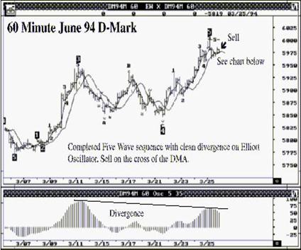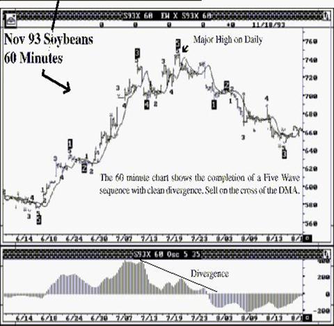 На 60-минутном графике показано завершение последова-тельности из Пяти Волн с очевид-ной дивергенцией Осциллятора. Продавайте на пересечении DMA.