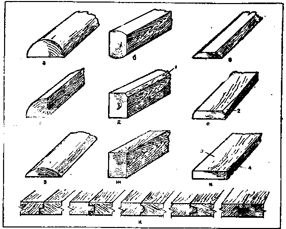 Рис. 21. Лесо- и пиломатериалы, используемые при строительстве: о — пластина; б — двухкантный брус; в — необрезная доска; г — четвертина; д — четы-рехкантный брус с обзолом; е — полуобрезная доска с обзолом; ж — чистообрезной брус; з — горбыль; и — обрезная доска; к — строганные шпунтованные доски; 1, 2 — обзол; 3 — пласть; 4 — ребро