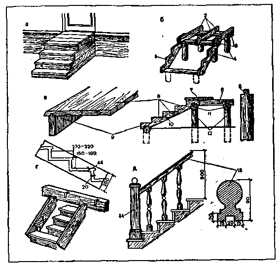 Рис. 83. Устройство крыльца: а — общий вид; б — устройство крыльца; в — деревянные ступени; г — тетива и ее опирание на брус и д — балясник; 1, 10 — тетива; 2 — бруски; 3 — лежни; 4 — стулья; 5, 6 — брусок; 7 — настил; Я — проступи; 9 — подступенок; 11 — лежни; 12 — стулья; 13 — поручень; 14 — тумба