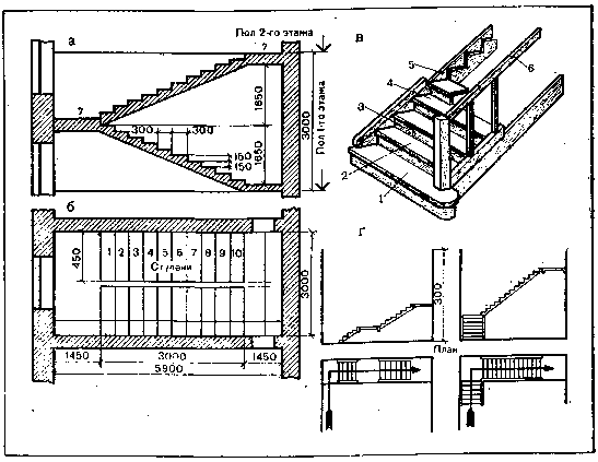 Рис. 84. Построение лестницы: а — разрез лестничной клетки; б — план лестничной клетки; в — деревянная лестница и ее детали; г — мансардные лестницы; 1 — фризовая ступень; 2 — ступень; 3 — подступенок; 4 — проступь; 5 — тетива; 6 — перила; 7 — площадка