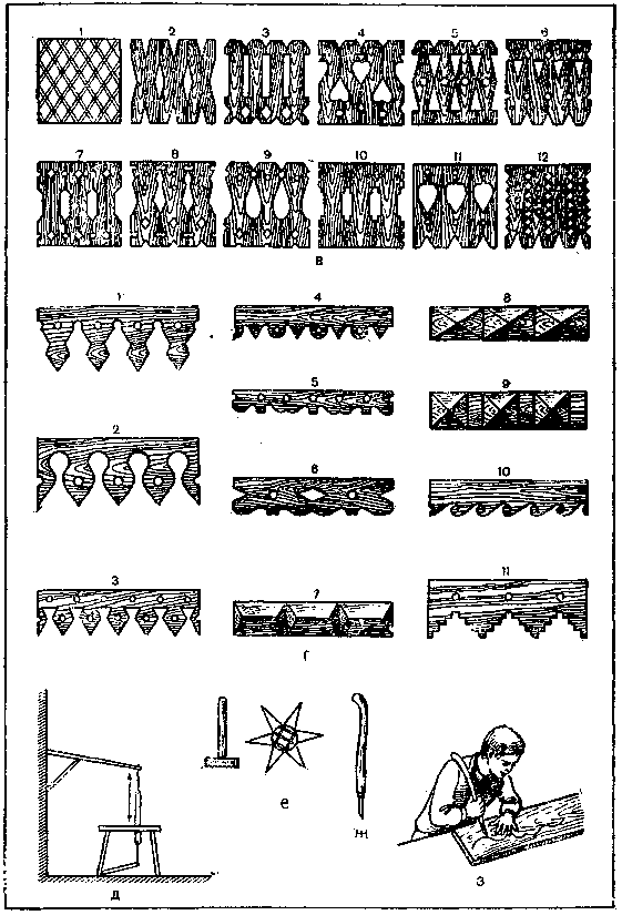 Рис. 211. Наружная отделка домов: а — наличники; б — детали наличников и карнизы; в — виды ограждений; г — накладные детали; д — ножной лобзик; е — чеканы; ж — специальный нож; з — выполнение резной детали