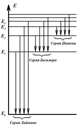 Рис. 3.3. Энергетические состояния атома и серии спектральных линий Все серии в спектре атома водорода могут быть описаны одной формулой, называемой обобщенной формулой Бальмера: