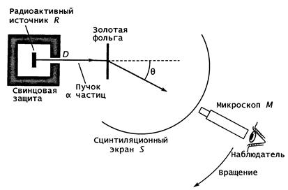 Рис. 3.4. Опыт Резерфорда Оказалось, что при прохождении α -частиц через слой какого-либо вещества (например, через фольгу из золота) наблюдается изменение направления их движения (рассеяние). Отклонившуюся частицу можно зарегистрировать с помощью экрана, покрытого веществом, которое при попадании в него α -частицы, откликается вспышкой света.