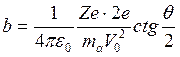 Рис. 3.5. Резерфордовское рассеяние На рис. 3.5 показана траектория отклонения α -частицы при попадании в кулоновское поле ядра. Резерфорд показал, что угол отклонения α -частицы зависит от величины так называемого прицельного параметра b. Можно рассчитать минимальный прицельный параметр b, при котором частица отклонится от прямолинейной траектории, то есть ощутит действие поля ядра: