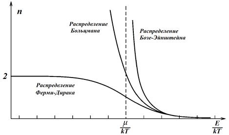 Кривые распределения Максвелла-Больцмана, Бозе-Эйнштейна, и Ферми-Дирака Если число частиц в системе не постоянно, то можно показать, что μ = 0 и функция распределения будет иметь вид: