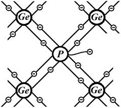 Рис. 12.3. Сведенное в плоскость изображение кристаллической решетки идеального 4-валентного кристалла Если кристалл идеальный, то все связи вокруг атома являются насыщенными – не имеющими свободных мест, а свободных электронов в пространстве между атомами нет (рис. 12.3). Предположим, что в кристалл вместо одного из основных атомов попал атом, валентность которого на единицу больше (атом фосфора P в кристалле Ge). 4 из 5 электронов фосфора распределятся между соседними атомами германия, а пятый электрон будет держаться рядом за счет довольно слабой связи (рис. 12.4).