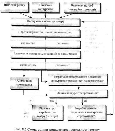 Якщо К> 1, то даний виріб має вищий рівень конкурентоспроможності від виробу-аналога, якщо К<1,то він поступається аналогу, при К= 1 — знаходиться на однаковому рівні. Схема оцінки (К) показана на рис. 8.5. Показник конкурентоспроможності виробника повинен включати 2 елементи: - критерій, що відображає в динаміці ступінь задоволення споживача