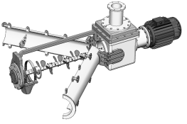 К основным элементам смесителя, указанной конструкции, относятся смесительная камера, один или два смешивающих вала с лопатками и приводом, дозаторы для подачи компонентов, расходные емкости и система управления для работы в различных режимах (автоматическом, полуавтоматическом, наладочном). Первая камера может быть только транспортной, подающей песок, вторая – смесительной. Вторая камера имеет вертикальный разъем, что удобно для чистки смесителя, т.к. из-за винтового вала происходит забивание камеры. Наиболее значимым результатом работы явилась разработка и получение нескольких декларационных патентов на полезные модели смесителей, позволяющих: - снизить вероятность забиваемости емкости смесителя и создать предпосылки появления оптимальной модели лопастного смесителя [11]; - проводить точное и разнообразное дозирование в процессе работы установки, позволяющее получить заданную прочность смеси после затвердевания в форме, [12]; - гомогенизировать состав сыпучих компонентов смеси [13]; - повысить и упростить обслуживание смесителя.