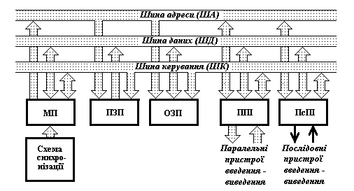 На рисунку представлена спрощена типова структура мікропроцесорного пристрою (або системи), призначеного для обробки даних або керування деяким процесом. Приблизно таку ж структуру мають мікро-ЕОМ широкого призначення. Почесне місце в цій структурі займає мікропроцесор, який безпосередньо виконує арифметичні і логічні операції над даними, здійснює програмне керування процесом обробки інформації, організує взаємодію всіх пристроїв, що входять до системи. Робота МП відбувається під дією сигналів схеми синхронізації, яка часто виконується у вигляді окремої ІС.