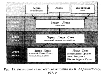 Итак, приручение животных и окультуривание растений резко изменили способ хозяйства и образ жизни человека. После периода охоты и собирательства пришло время земледелия, на смену бродяжеству пришла оседлость. Соединение животноводства и зерноводства привело к появлению современного типа сельского хозяйства — двухотраслевого или смешанного. Именно эти достижения человечества принято. Приручение животных и зарождение пастушества дали человечеству новый источник энергии — тягловый скот. На смену палкам-копалкам пришел плуг, запряженный волами. Резко поднялась производительность труда. Чтобы прокормить одного человека охотой и собирательством, требуется 2 кв. км площади, а при эффективном земледелии достаточно всего 100 кв. м земли. Переход от экстенсивного к интенсивному хозяйству длился несколько тысяч лет, в результате продуктивность земли выросла в 20 тыс. раз. Переход к земледелию продолжался очень долго. Гораздо дольше, нежели переход к машинной технике. Специалисты подсчитали, что он продолжался 3 тыс. лет. Столько длилась первая мировая революция — неолитическая. Переход к искусственному взращиванию зерновых произошел не сразу. Потребовался промежуточный этап, на котором человечество опробовало искусственное взращивание овощей. Таким образом, огородничество представляет собой как бы пробное, или пилотажное исследование возможностей земледелия. При огородничестве трудятся вручную примитивными средствами труда. Иногда подобный тип хозяйствования называют фермерством. Культивирование корнеплодов соединялось с разведением рогатого скота. Постепенно от корнеплодов перешли к культивированию ячменя и пшеницы. Огородничество плавно перерастало в пашенное земледелие.
