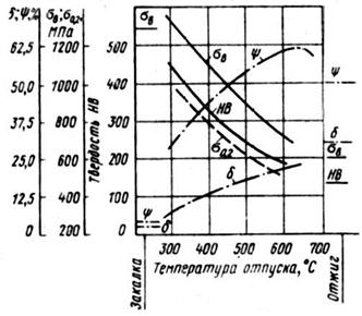 Рис. 27. Механические свойства стали 40 в зависимости от температуры отпуска