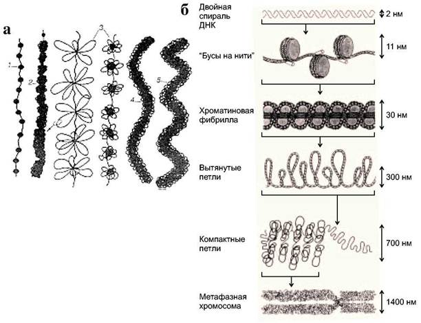 Процесс компактизации ДНК, приводящий в конце концов к построению плотного тела митотической хромосомы, проходит через несколько структурных уровней. ü Первый уровень – нуклеосомный - обеспечивает сверхскручивание ДНК по поверхности гистоновой сердцевины. ü Второй – нуклеомерный (сверхбусина), где идёт объединение 6 нуклеосом в виде глобулы. Так как все эти уровни компактизации происходят на огромных линейных молекулах ДНК, то ряд сближенных нуклеомеров и образует 30-нанометровую фибриллу ДНП. ü Третий уровень - хромомерный: петли фибрилл ДНП, объединённые скрепками из негистоновых белков, образуют компактные тела (0,1 - 0,2 мкм), которые при искусственной деконденсации дадут розетковидные структуры. Расположение петлевых доменов, хромомеров, может быть неравномерным: участки тела митотической хромосомы, обогащенные ими, могут соответствовать полосам при дифференциальной окраске хромосомы. ü Четвёртый уровень – хромонемный: сближенные в линейном порядке хромомеры образуют толстые (0,1 – 0,2 мкм) нити, которые можно уже наблюдать и в световом микроскопе. Характер упаковки этой нити в теле хроматиды ещё недостаточно выяснен: возможна спиральная укладка хромонемы, но не исключено образование ею и ещё одного уровня петлевых структур. Конечно, такая общая схема организации митотических хромосом очень неполно отражает особенности строения их специализированных участков, таких как ядрышковый организатор, теломеры и центомеры. В заключение этого обзора можно прийти к выводу, что при изучении Большим шагом в моделировании структуры метафазной хромосомы оказалось изучение структуры хроматина после удаления гистонов из хромосом обработкой 2М NAC1. В таких случаях удаляются все гистоны и большая часть негистоновых белков. После этой обработки на месте метафазной хромосомы остается остов (scaffold) из негистоновых белков, из которого выходят и распределяются петлеобразные нити ДНК длиной 10-30нм (рис. 4). Центральный скаффолд сохраняет очертания метафазной хромосомы, даже после полного переваривания ДНК нуклеазами. Петли, выходящие из скаффолда, часто называют "петлевыми доменами". Если обработать ДНКазой препараты хромосом с петлями, то можно получить белковые остовы и анализировать их состав. Оказалось, что в них присутствует около 20 видов белков негистоновой природы, сходных с белками интерфазного ядерного матрикса. Действительно, в теле хромосомы есть негистоновые белковые скрепки, сшивающие основания боковых петель ДНК, но эти связки разбросаны рыхло по объему хромосомы. Скаффолды формируются только в экспериментальных условиях и реальное существование их в нативных хромосомах не продемонстрировано.