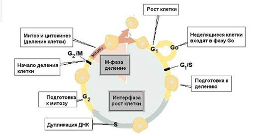 Жизнь клетки и переход от одной фазы клеточного цикла к другой регулируется изменением концентраций белков циклинов, как это показано на рисунке. Толщина цветных секторов соответствует концентрации циклинов. При подготовке к делению происходит репликация ДНК, на каждой хромосоме синтезируется ее копия. Пока эти хромосомы после удвоения не расходятся, каждая хромосома в этой паре называется хроматидой. После репликации ДНК конденсируется, хромосомы приобретают более компактную укладку, и в таком состоянии их можно увидеть в световом микроскопе. Между делениями эти хромосомы не столь конденсированы и в большей степени расплетены. Понятно, что в конденсированном состоянии им трудно функционировать. Хромосома имеет вид в виде буквы Х только во время одной из стадий митоза. Раньше считалось, что между делениями клетки хромосомная ДНК (хроматин) находится в полностью расплетенном состоянии, но сейчас выясняется, что структура хромосом достаточно сложная и степень деконденсации хроматина между делениями не очень велика.