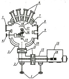 Бурное развитие технологии МЛЭ в последние десятилетия привело к появлению многообразных установок, существенно различающихся геометрией и функциональными возможностями. Кроме того, в последнее время наметилась тенденция к узкой специализации установок МЛЭ, когда ростовая камера и оборудование проектируются под вполне конкретные задачи и предназначены для работы с определенным классом материалов (Si, Ge, нитриды, арсениды или фосфиды А3В5 полупроводники семейства А2В6 и т.д.). Однако можно выделить основные узлы, общие для всех установок МЛЭ: системы получения и поддержания сверхвысокого вакуума, необходимого для реализации режима молекулярного потока и, прежде всего, для снижения интенсивности неконтролируемых потоков молекул остаточной атмосферы; ростовая камера (давления остаточной атмосферы не ниже 10-10 мм. рт. ст.), а также одна или несколько вакуумных камер, изолированных и имеющих независимые системы откачки, предназначенные для загрузки, транспортировки, хранения и предварительной обработки образцов и подложек; блок источников молекулярных пучков различного химического состава и интенсивности, с индивидуальными заслонками; многостепенный манипулятор с держателем образца, обеспечивающий нагрев, вращение, передачу образца, а также фиксацию его в определенном ростовом положении; средства контроля процесса роста. Системы получения и поддержания сверхвысокого вакуума может включать в себя следующие безмасляные средства откачки: - магнито-разрядные (производительностью 220-400 л/с); - криогенные (гелиевые замкнутого цикла, производительностью 1000-1500 л/с); - титаново-сублимационные (производительностью 5000-20000 л/с); - азотные криопанели; - турбо-молекулярные (производительностью 100-2000 л/с) с форвакуумной откачкой на выходе. Ростовая камера может иметь вертикальную геометрию, когда образец во время роста располагается ростовой поверхностью вниз (типичные примеры установки V90, Compact 21, GEN 20) и горизонтальную — образец во время роста развернут относительно вертикали на угол более 45° (Riber 32 P, GENII, GENIII). Вертикальная геометрия является предпочтительной для промышленных установок, т.к. использует простые манипуляторы и системы транспортировки образцов, а также предохраняет поверхность подложек от загрязнения механическими частицами. Все конструктивные материалы являются химически- и термостойкими, с малым газоотделением вплоть до температур ~1500С pBN, Та, Мо, W, кварц). Схематическое изображение установки МЛЭ Riber 32P представлено на рис. 2. В состав установки входят три сверхвысоковакуумные камеры: ростовая (3), камера перезарядки (2), шлюзовая (12), разделенные высоковакуумными затворами (11), а также азотный бокс загрузки и выгрузки образцов (13). Использование такой конструкции позволяет избегать частого вскрытия ростовой камеры на атмосферное давление и нарушения вакуумных условий при загрузке и выгрузке образцов. Каждая камера имеет независимые средства откачки. Для исключения взаимного теплового влияния источников и снижения газоотделения от нагретых конструктивных элементов и стенок камеры ростовая. Камера снабжена тремя криопанелями, охлаждаемыми жидким азотом (LN2): одна из них окружает непосредственно зону эпитаксиального роста (10), другая обеспечивает термическую изоляцию эффузионных источников (7), а третья расположена в