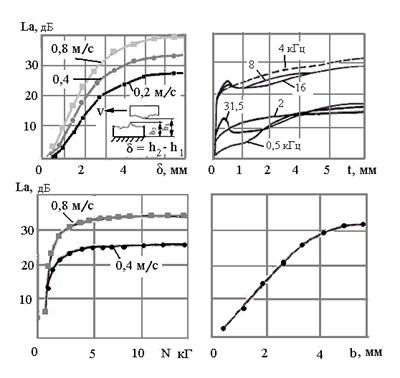 Рис. 3. Примеры изменения уровня ВА сигнала от сближения (δ) контактирующих поверхностей, глубины резания (t), нормальной силы (N), ширины контакта (b). При моделировании акустических свойств фрикционного контакта при сухом трении в основу было положено утверждение, что ВА сигналы возникают в результате силового (ударного) взаимодействия неровностей контактирующих тел. Удары могут возникать в моменты соприкосновения контрвыступов и в моменты их разъединения. На рис. 4 схематично показаны структурные компоненты реального контакта шероховатых поверхностей. Помимо номинальной площади контакта (Аа) в число компонентов на схеме показана контурная площадь контакта (Ас), на которой располагаются контактирующие выступы, формирующие реальную площадь контакта (Аr). Совокупность всех площадок реального контакта формирует площадь фактического контакта (ФПК). Поверхности твердых тел обладают свободной поверхностной энергией. Это обусловливает высокую активность поверхностных слоев, принимающих участие в трении. Таким образом, склонность твердых тел к схватыванию определяется их свободной поверхностной энергией (т. е. склонностью к адгезии) и их способностью пластически деформироваться. Последнее обстоятельство обеспечивает достаточное сближение поверхностей для возникновения адгезионных мостиков. При возникновении адгезионных мостиков сокращается свободная энергия поверхностей, система становится более устойчивой. Для разрыва мостиков требуется затратить энергию, часть которой пойдет на увеличение свободной поверхности. На рис. 4 показаны фазы взаимодействия неровностей. Часть из них находятся в состоянии образования адгезионных мостиков сварки, а другая часть находится в фазах соударения или в фазах разрыва связей. Соударение и разрыв взаимодействующих неровностей генерируют ВА энергию.