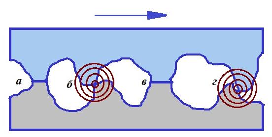 Рис. 5. Схематичное представление элементарных процессов во фрикционном контакте: а, в – фаза образования адгезионных мостиков; б – фаза соударения неровностей при вступлении в контакт; г – фаза разрыва адгезионных мостиков