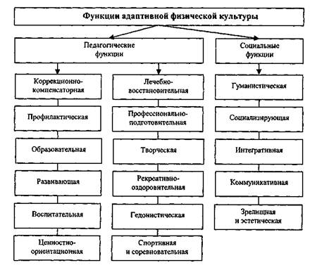 альные отношения с другими институтами, общественными явлениями и процессами, формирующими социальные функции. Несмотря на многочисленные исследования, проблему классификации функций физической культуры нельзя считать завершенной. Десятки функций — внешних, внутренних, общекультурных, специфических, общих, особенных, единичных - порождают иллюзию о всемогуществе физической культуры в решении любых социальных вопросов: от экономики и политики до науки и религии. Во избежание разно-масштабности рассмотрения функций в АФК выделены группы функций: педагогические, свойственные только ей и реализуемые в процессе занятий физическими упражнениями, и социальные как результат совместной деятельности с другими социальными институтами (учреждениями соцзащиты, специального образования, медико-психолого-педагогической помощи, родителями и др.) (см. рисунок). При этом выбраны не все известные функции, а лишь те, которые имеют приоритетное значение для данной категории лиц. Функции адаптивной физической культуры 174 ________________ 15.1. Педагогические функции Коррекционно-компенсаторная функция АФК является ведущей для всех ее видов. Основанием для коррекции служат отклонения в физической и психической сфере, в состоянии здоровья. Как правило, коррекция двигательных нарушений в процессе многократного повторения упражнений оказывает и развивающее воздействие, а развивающая функция всегда носит индивидуальный характер, потому ее с полным правом можно назвать коррекционно-развивающей. Многообразие коррекционных задач позволило выделить следующие основные направления: 1) коррекция, профилактика и развитие сенсорных функций (зри 2) коррекция психических нарушений: внимания, памяти, речи,