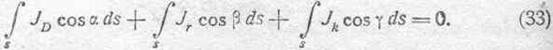 где Jr — плотность проводникового тока, b— угол, составляемый направлением этого тока с внутренней нормалью в данной точке поверхности, Jk — плотность конвекционного тока и g'—соответствующий ему угол. В данной случае мы имеем в виду внутреннюю нормаль к поверхности, ибо речь идет о токах, которые должны покрыть изменения Q, связанные с токами смещения, рассматриваемыми нами, согласно условию, в направлении внешней нормали. Иными словами, токи проводниковый и конвекционный текут сквозь поверхность, в общем обратно току смещения. Принимая во внимание (32), можем написать: