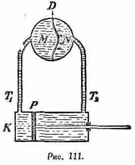диэлектрики, но только не непрерывно в одном направлении, ибо упругие реакции в диэлектрике в конце концов кладут предел той деформации электрического смещения, процесс возникновения или вообще изменения которой и составляют, по Максвеллу, ток в диэлектрике. Не трудно, однако, рассмотренную выше модель изменить так, чтобы она иллюстрировала все то, что нами говорилось о замкнутости тока в цепи с конденсатором. Возьмем опять прежний цилиндр К. с поршнем Р, приводимым в попеременное движение при помощи соответствующего механизма. В данном случае пусть трубы T 1 и T 2 соединяют цилиндр, как показано на рис. 111, с двумя диаметрально противоположными сторонами одного общего резервуара, внутри которого находится сплошная упругая перегородка D, состоящая, например, из резиновой пластины и делящая весь объем резервуара на две части, М и N. Допустим далее, что у весь объем рассматриваемой системы, т. е. цилиндр, соединительные трубы и камеры М и N, сплошь заполнены жидкостью, скажем, водой. В отличие от предыдущего случая, камеры М и N не изолированы теперь одна от другой. Действительно, всякое увеличение количества воды в камере М вызовет упругую деформацию перегородки D, которая будет изгибаться и при этом вытеснит соответствующее количество воды из камеры N. При каждом данном значении разности давлений в камерах М и N степень деформирования упругой перегородки D будет совершенно определенная и притом такая, что упругая реакция со стороны перегородки будет уравновешивать разность давлений с обеих ее сторон. Если эта разность давлений перестанет существовать, упруго деформированная перегородка немедленно вернется в свое нормальное положение, ее вынужденное состояние прекратится. При переменном движении поршня, т. е. при возникновении в рассматриваемой системе переменной „вододвижущей силы", перегородка D будет периодически изгибаться то в ту, то в другую сторону, соответственно направлению тока жидкости и вообще материи в той замкнутой цепи, которую в настоящем случае представляет наша система. Таким образом, модель, изображенная на рисунке 111, схематически иллюстрирует замыкание электрического тока через диэлектрик.