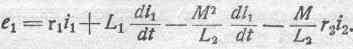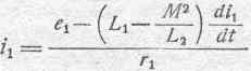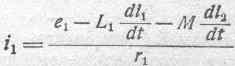 Пусть L 1 и L 2 — их коэффициенты самоиндукции, r 1 и r 2 — омические сопротивления, М-— коэффициент взаимной индукции. В одной из них (в первой) действует некоторая внешняя электродвижущая e 1в другой никакой внешней ЭДС нет. Для простоты возьмем случай, когда: L 1=const, L 2=const, М =const. Составим уравнение для тока в первой цепи. Сила тока i 1 в каждый данный момент равна, согласно закону Ома, сумме действующих в контуре ЭДС, деленной на сопротивление, т. е.