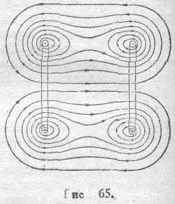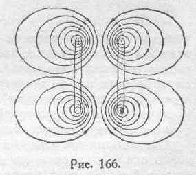 будет возрастать по мере уменьшения М, Ясно, конечно, что при этом будет возрастать полный магнитный поток, сцепляющийся с каждым из рассматриваемых контуров. Таким образом, и в последних примерах все формулировки закона движений электродинамической системы оказываются тесно связанными между собой, так как сводятся к констатированию следствий основного физического процесса, представляющего собою и в данном случае проявление механических свойств магнитных линий: их продольного тяжения и взаимного расталкивания. Во избежание недоразумений необходимо еще обратить внимание на следующее обстоятельство. Окончательная картина расположения магнитных линий в случае какой угодно сложной системы, вообще, и в случаях, схематически представленных на рис. 165 и 166, в частности, является результатом соответствующих преобразований сосуществующий потоков самоиндукции и потоков взаимной индукции. В связи с этим, тот поток, который мы называем потоком взаимной индукции (Mi 1или Mi 2 в простейшем случае двух цепей) может в значительной степени численно отличаться от результирующего потока, общего для двух или нескольких, вообще, отдельных цепей, входящих в состав рассматриваемой системы. В основном положении, сформулированном в параграфе 107, и гласящем о стремлении электродинамической системы увеличить