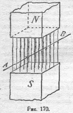 Основная роль бокового распора и продольного тяжения магнитных линий. Из рассмотренных нами примеров ясно, что все приведенные выше формулировки закона движений в электродинамической системе по существу являются именно лишь различными формулировками одного и того же закона, являющегося интегральным выражением тех механических свойств (бокового распора и продольного тяжения), которыми обладают магнитные линии и которые с фарадеевской точки зрения являются единственный реальным источником всех обнаруживаемых в электродинамических системах механических сил электромагнитного происхождения и вызываемых ими движений. В зависимости от особенностей электродинамической системы, с которой мы имеем дело в каждом частном случае, оказывается практически более удобной та или иная формулировка: если мы имеем дело с выпуклым единичным контуром, т. е. с таким контуром, кривизна которого везде одного знака, проще всего говорить о стремлении его к увеличению охватываемой им площади; если контур расположен во внешнем магнитном поле,— наиболее удобна формулировка, гласящая о стремлении к охвату наибольшего внешнего потока. Именно, эта формулировка часто находит себе применение при рассмотрении электродинамических взаимодействий в электрических машинах, так как всякая электрическая машина представляет собою более или менее сложную систему контуров (витков), расположенных во внешнем для них магнитном поле основного потока. Однако, иногда применяется и другой подход к анализу и расчету сил, действующих в электромагнитных механизмах. Именно, иногда исходят из рассмотрения сил действующих на отдельный участок проводника, несущего ток и расположенного во внешнем магнитном поле. Ниже (§ 117) будет дана зависимость, позволяющая рассчитывать силу, действию которой подвергается каждый элемент длины такого проводника. Здесь же мы отметим лишь, что случай „одного проводника" (схематический рис. 170) нисколько не отличается по существу явления от рассмотренных выше случаев одного или нескольких контуров, так как проводник, несущий ток, всегда является лишь частью некоторого контура, некоторой замкнутой электрической цепи. Стало быть, и к этому случаю все указанные выше формулировки полностью приложимы, т. е. электромагнитная сила и в этом случае определяется из основного соотношения (119):
