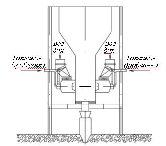 Для сжигания огрубленной пыли и дробленки (R5 = 5…10 %) в высокотемпературном вихре камера сгорания выполнена в виде циклона. Дробленка подается через вихревые горелки первичным воздухом (15…20 % всего подаваемого на горелке воздуха). Вторичным воздухом подается в циклон тангенциального через сопла, размещенные на боковой поверхности циклона, со скоростью до 150 м/с. (рис. 9)