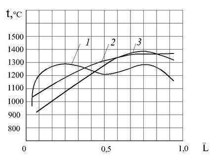 Рис. 24. Распределение температуры на выходе из топки при различной компоновке горелок: 1 − тангенциальной; 2 − фронтовой; 3 − встречной