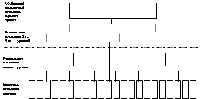 Свойства, характеризуемые качество оцениваемого объекта представляют собой совокупность, упорядоченную в виде многоуровневой иерархической структуры [26]. Показатели качества, характеризующие эти свойства можно комбинировать между собой, добиваясь все большего и большего обобщения свойств, формирующих в целом представление о качестве. Структура показателей качества является многоуровневой, основу которой составляют единичные ПК, а на верхнем уровне находится один единственный обобщенный ПК, по которому судят о качестве (рис. 13).