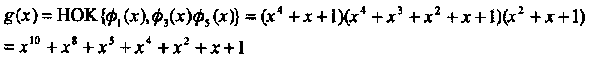 Порождающий многочлен кода С равен g(x) = х10 + х8 + х5 + х4 + х2 + х + 1. Предположим, что информационный полином равен u(х) = х + х2 + х4. Тогда соответствующее ему кодовое слово равно Пусть принятое слово равно r(x) = 1+х + х2+х3 + х4 + х6 + х8 + х11 + x14, соответствующее вектору r(х) =v(х)+e(х), полученному в результате передачи слова v по ДСК. (Вектору е соответствует многочлен ошибок е(х) = 1 + х6 + х12. Хотя декодеру этот вектор ошибок неизвестен, он используется здесь для упрощения вычисления синдромов.) Синдромы равны: