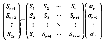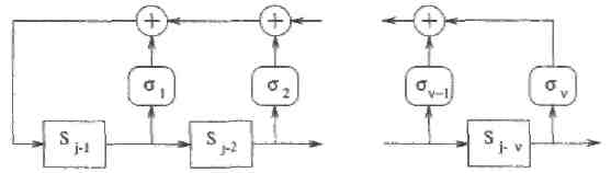 Рис. 23. ЛРОС с отводами σ1, σ 2,..., σ v и выходом S1, S2,..., S2v. регистра (сдвига) с обратной связью (ЛРОС), аналогичного показанному на Рисунке 23, который генерирует известную последовательность синдромов S1 S2,...S2td. Целью ВМА является построение многочлена (обратной связи) σ (i+1)(х) наименьшей степени, удовлетворяющего следующему уравнению, выведенному из (3.16):