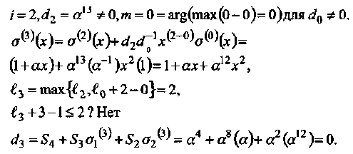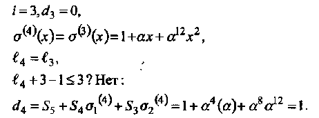 Заметим также, что в Алгоритме Берлекэмпа-Мэсси используются программные инструкции (если — то). По этой причине ВМА не слишком удобен для аппаратной реализации. Тем не менее, по числу операций в конечном поле GF(2W) этот алгоритм весьма эффективен. Пример 34. Пусть С двоичный (15,5,7) код БЧХ, исправляющий три ошибки из Примера 33. Для проверки вычислений и просто для справки приводится степенное и векторное представление элементов поля GF(16), порожденное примитивным многочленом р(х) = 1 + х + х4: Таблица элементов поля GF(24), р(х) = 1 + х + х4: