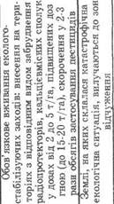 нижче за ГДК; рухомих форм у грунтах нижче за ГДК; • задовільний - вміст валових форм важких металів у • передкризовий - вміст валових форм важких мета • кризовий вміст валових форм важких металів у • катастрофічний - вміст валових форм важких ме Система заходів щодо підтримання екологічної стійкості земельних ресурсів та усунення негативних явищ наведена в табл. 22. В цілому, типи екологічної ситуації за рівнем прояву кризових явищ наведені в табл. 23. Забруднення навколишнього середовища в результаті аварії на ЧАЕС впливає на здоров'я людей не тільки прямо, але й опосередковано порушенням екологічної рівноваги в природі. Останнє значною мірою пов'язане з якісними й кількісними змінами в мікробіоценозах біосфери. Як відомо, радіація є значним чинником дії на мікроорганізми, спричиняючи за високих доз їх загибель. Є відомості про виникнення в опромінених тварин дис- « «а а