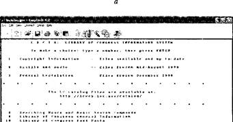 f, ('«^ac^licwb» о) V?" ^ a'vm^; в ■ Рис. 6.1. Примеры экранов Telnet-клиента EasyTerm 4.2: а — стартовый экран; б — открытие сайта Locis (Библиотека Конгресса США); в — просмотр оглавления раздела Federal Legislation