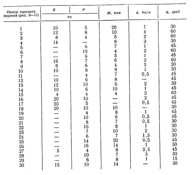 Визначити реакції опор конструкції. Схеми конструкцій наведені на стор. 31 – 33 (розміри – у м); дані – у таблиці.